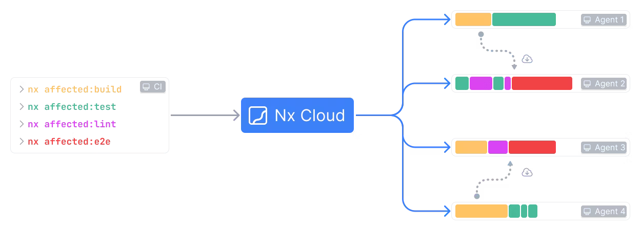 - Distributed Task Execution โ the most important feature for truly scaling up repositories. Nx already knows about your project graph and what tasks depend on each other. With Nx Cloud, you can leverage this knowledge to distribute tasks smartly across multiple agents while making sure that everything is run in the correct sequence. This can speed up your CI times by orders of magnitude!